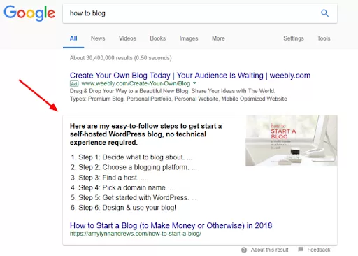 A featured snippet, also known as position zero, is found at the top of SERP inside a rectangular box. It was launched in 2017 and has since become a shortcut for achieving prominence in Google search rankings. Generally, a featured snippet appears when the search query is in the form of a specific question, and a well-structured search result is expected by the user. The first organic link on SERP is inarguably the most sought-after position for increasing CTR and generating organic traffic to a website. The featured snippet feature provides the opportunity to rank in the first coveted position and steer away from a significant chunk of traffic from competitors.