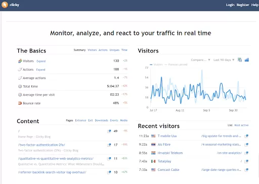 - With Clicky, you can monitor, analyze, and react to your traffic in real-time, so you are always in the know about what’s happening on your website at this very moment.