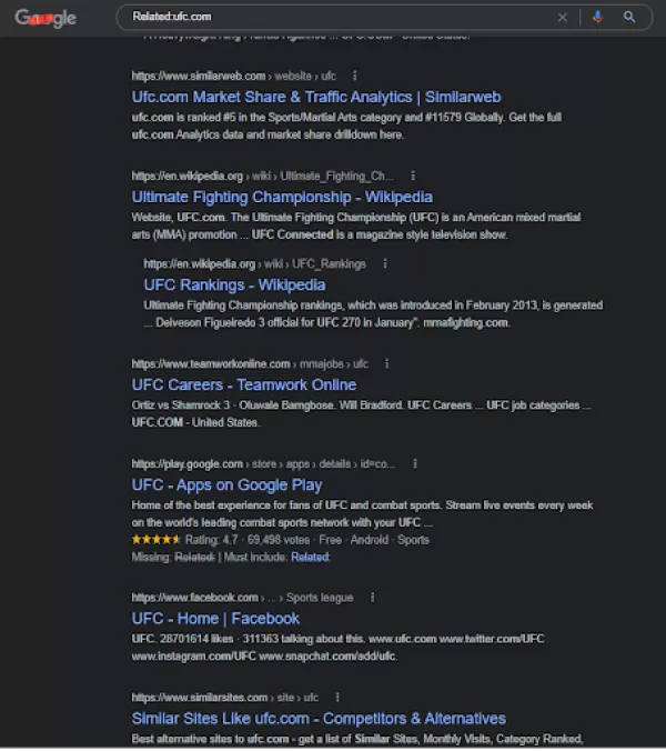 With the Related: command, you are instruct Google to search for pages related to a term or URL. Here’s an example: