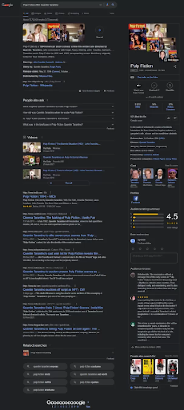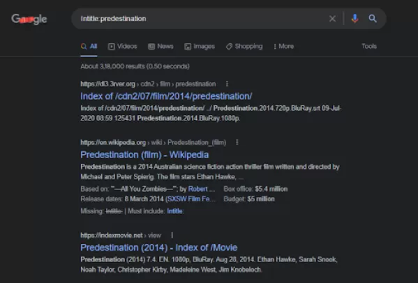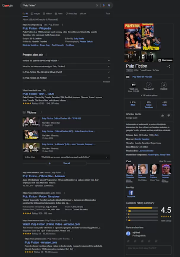 This command allows the user to find information about a specific film. If the film you search for is currently playing in theaters, Google will also display the show timings from your local multiplexes and movie theaters.
