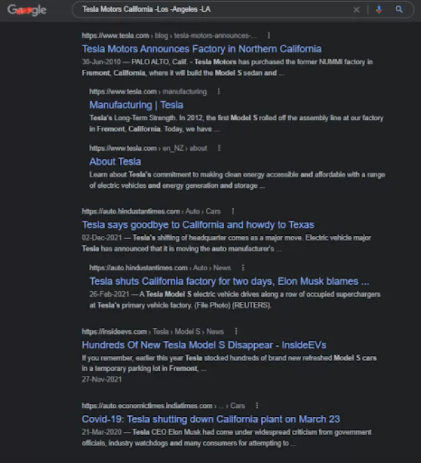 By adding the hyphen symbol (-) between two terms, the term placed after the hyphen can be excluded from the search. For instance, by searching for “Tesla Motors California -Los -Angeles -LA”, you’ll get the following result: