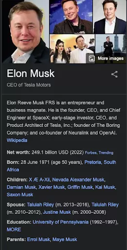 Therefore, this schema aims to provide the said information about a person without the hassle of digging deeper by clicking a link to a website. For example, when we Google “Elon Musk”, we get a result that shows:
