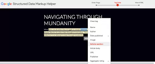4. Now it’s time to select the Elements that are to be Marked Up Here, we have highlighted the subheading so that we can add the “Article Section” markup. After finishing highlighting, we have selected the “Article Section” markup from the tooltip.
