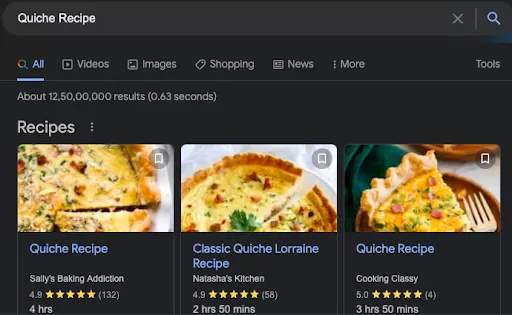 It is incorporated in the source code of a web page and dictates the way Google displays the content in search results. For example, when we Google “Quiche Recipe”, we get search results from pages that have included structured data in their code: