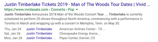 The Event Schema Markup gives all required information regarding the schedules, timings, location, dates, prices, etc., of events such as concerts, lectures, webinars, and more. The information becomes visible in the SERPs when this markup is incorporated in the code of a web page providing such information.