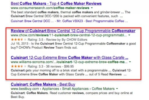 For example, a Review Rich Snippet shows the reviews given by users to a business, restaurant, or any other entity listed in the search results. You can identify such a snippet through ‘star’ ratings out of a total of five right below the page title on the SERP.