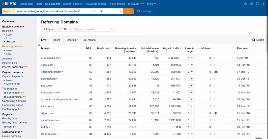 - Now click on the referring domain tab to get a referring domain report that shows all the websites that are linking back to your webpage and a ton of other insights including the amount of organic traffic.