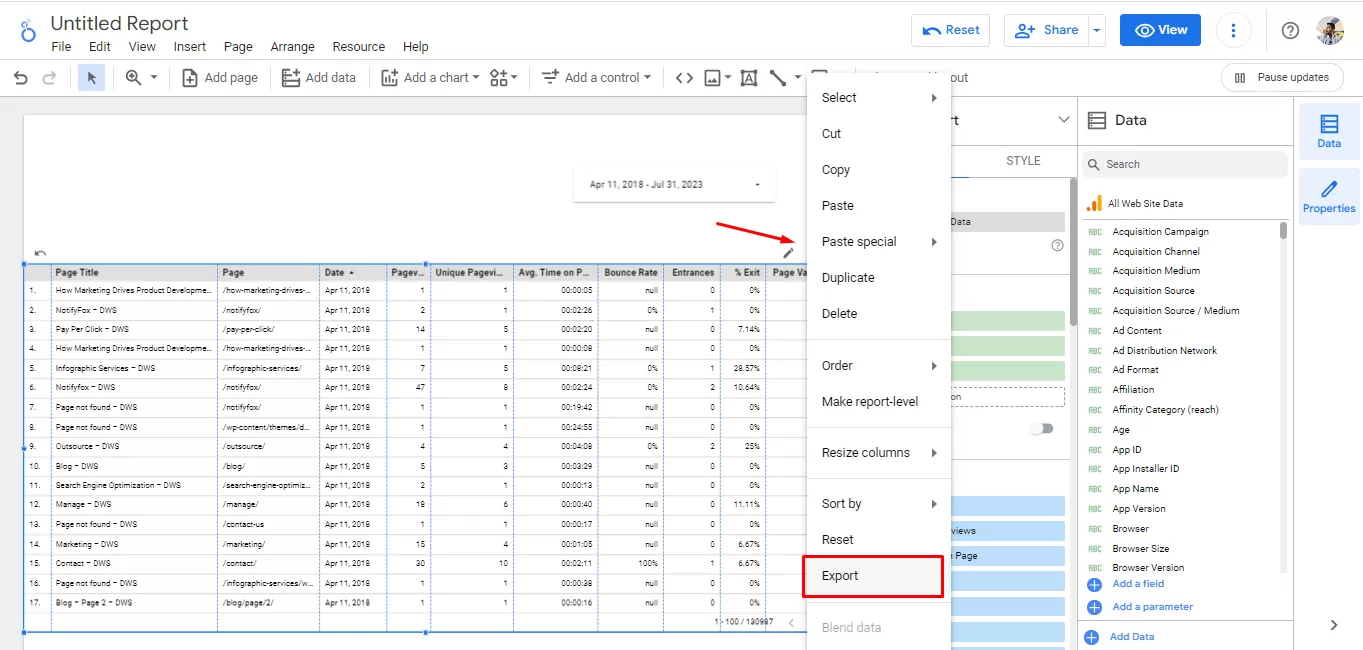 Now we have everything that we need. All we need to do is to extract the data from the Data Studio to CSV. To do that, you have to hover over the table, and you will see the kebab menu icon. Click on that. In that, you will see a list of menus. In that list, you have to click on the export menu.