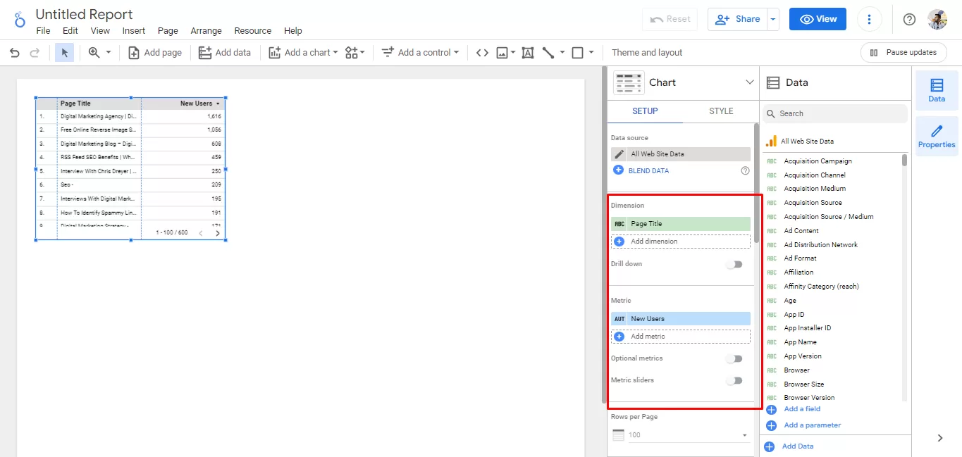 You have been successfully connected with the Google Analytics account and will see the following table. As highlighted in the screenshot, you can see the Dimensions and Metric. We will update our Dimensions and Metric to extract the Behavior -> Site Content -> All Pages Data.