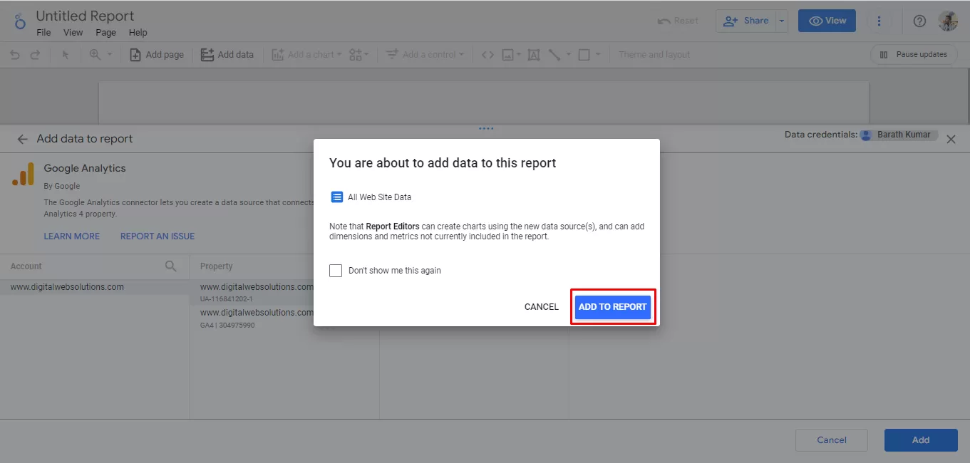 Once the connection is successful, you will see a popup: “You are about to add data to this report.” Click on Add To Report.