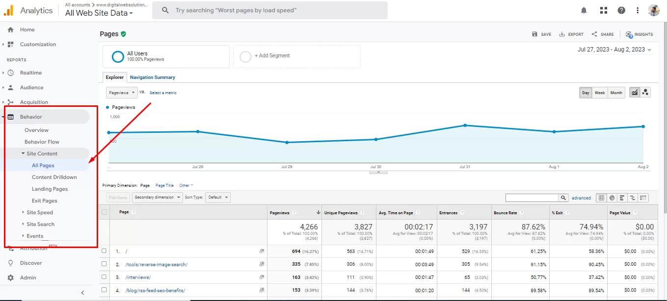 Ex: Metrics include Bounce Rate, Pageviews, and Time on Page.
