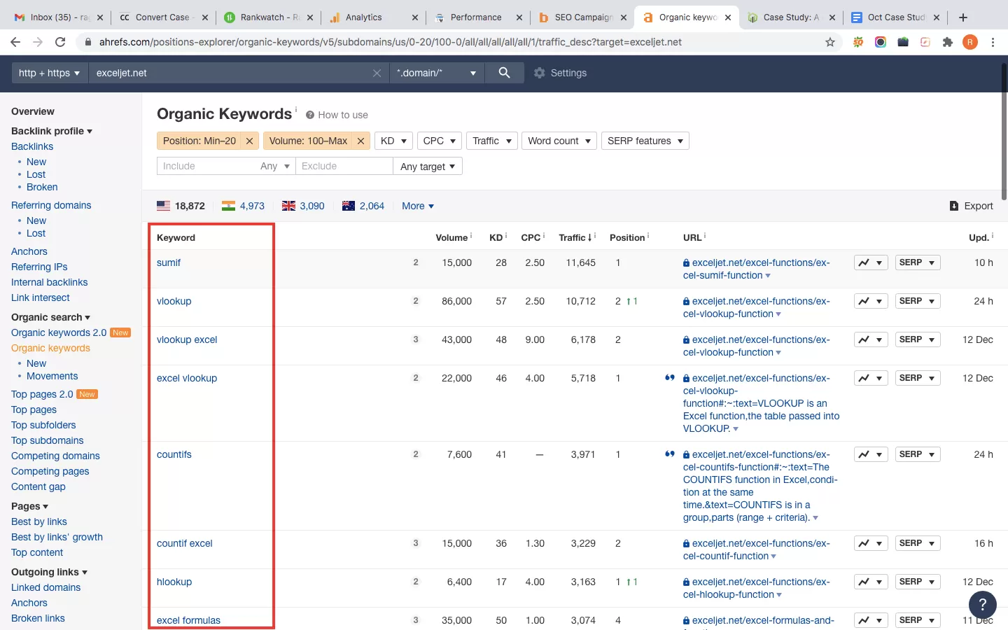 One look at exceljet.net’s organic keywords on Ahrefs gave us a list of keywords that they were ranking for and the relevant pages they were using for these keywords.