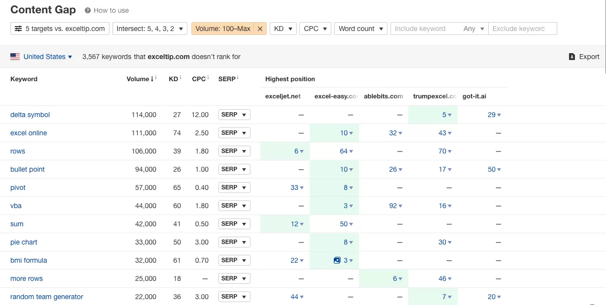 Example: For the top competitor, exceljet.net, we take into account keywords which are ranking in top 20 results with a search volume of at least 100.