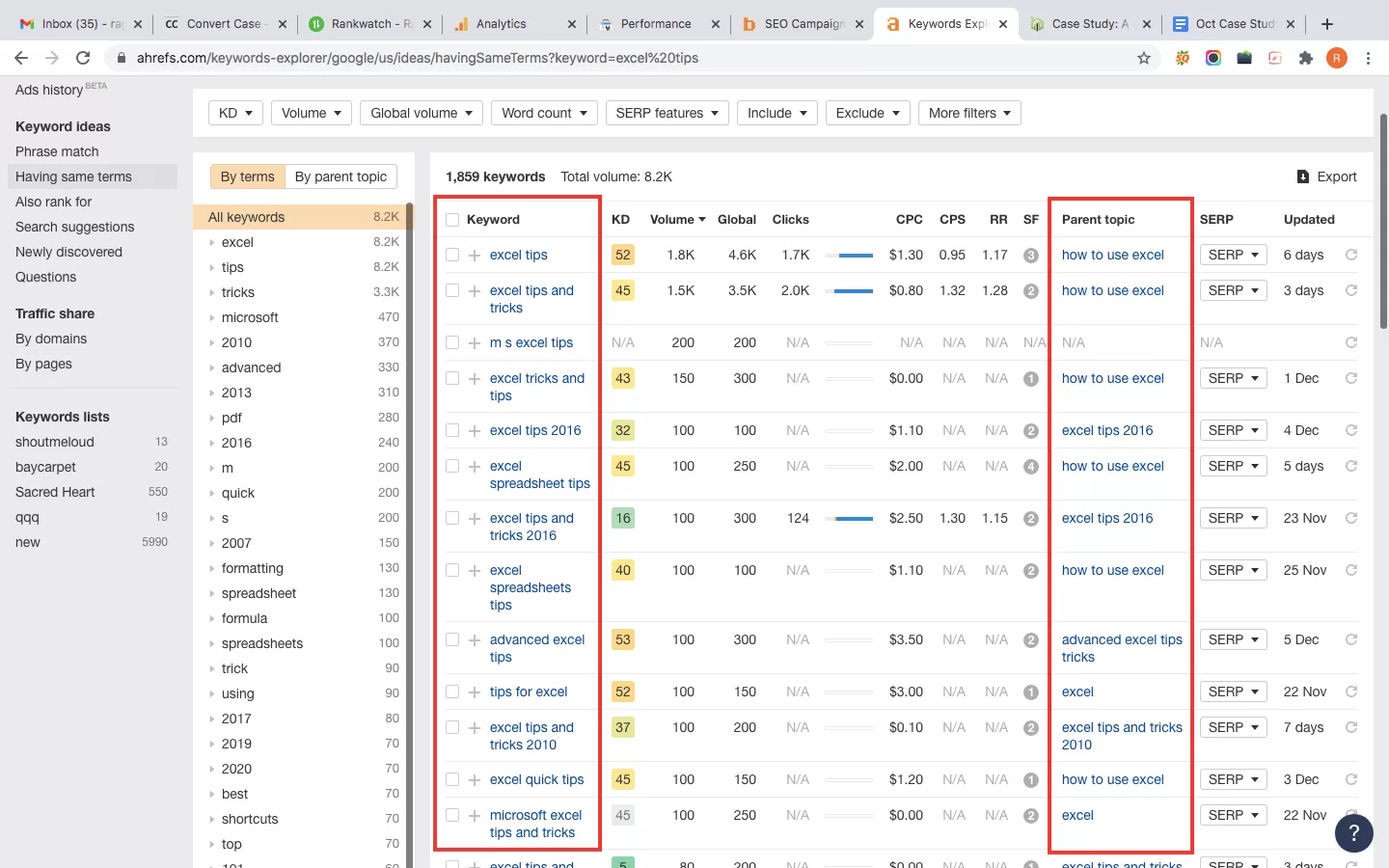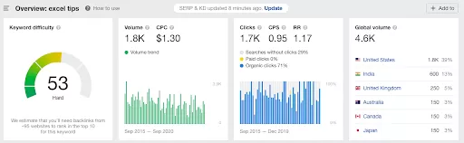 As seen below, our initial search for broad keywords like “excel tips” revealed that Keyword Difficulty is high at 53