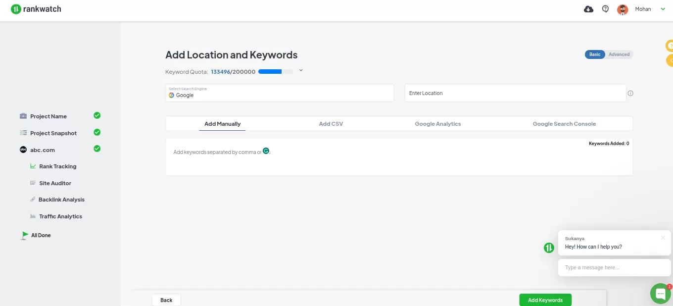 Getting started with RankWatcher is pretty straightforward. Since the tool is used by both early-career and seasoned marketers, its functionality is divided into ‘Basic’ and ‘Advanced. You can choose from 13 search engines to track your rankings based on a specific location. You can also select multiple locations for a single search engine in order to access rankings data for all those search engines simultaneously. Just follow the steps given below to start tracking your rankings.