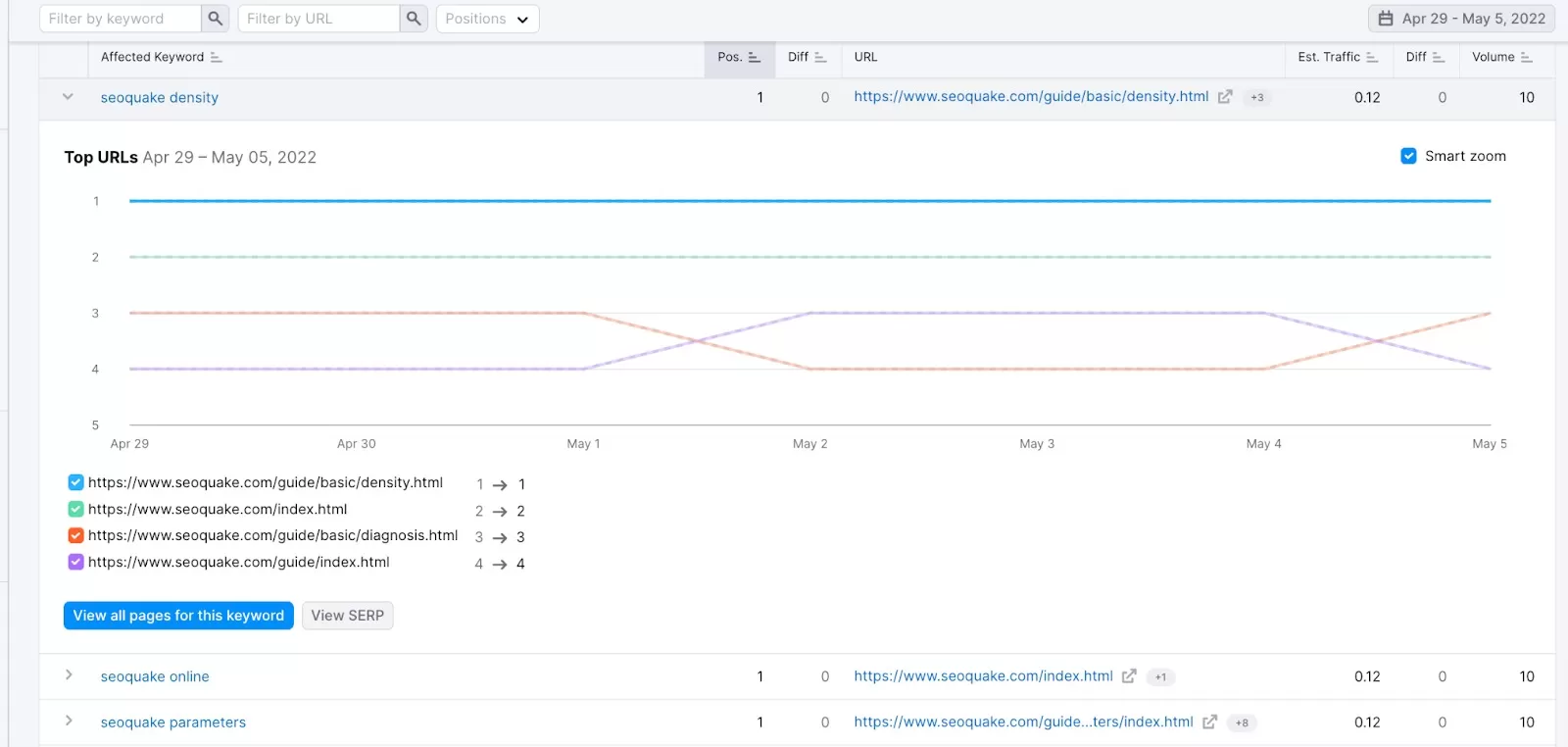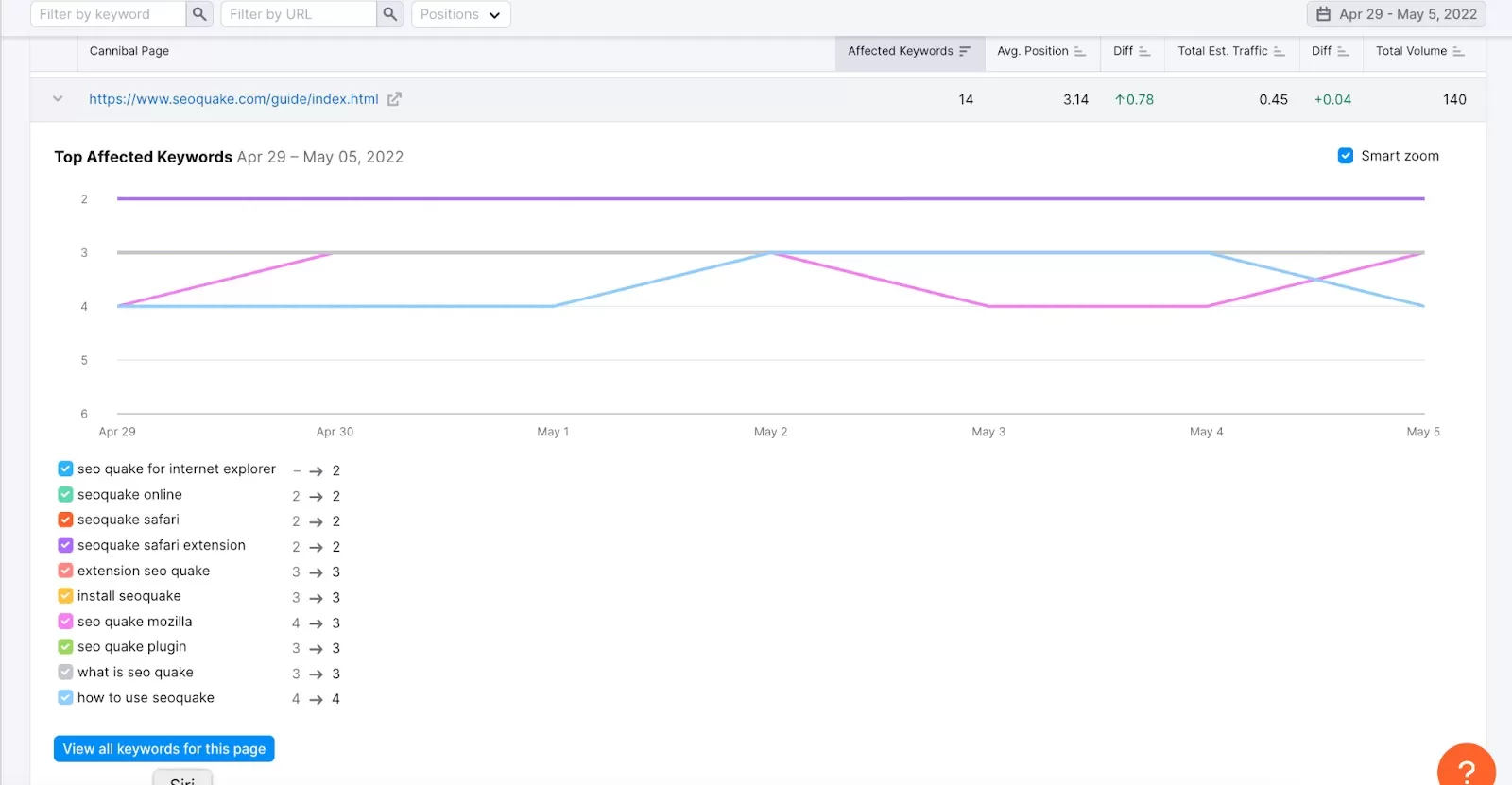 Keyword Rank Tracker: It lets you monitor the rankings of multiple URLs for a single keyword. If you notice two or more URLs often swapping positions for the same keyword, that’s a telltale sign.