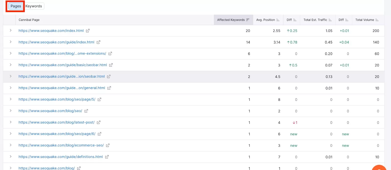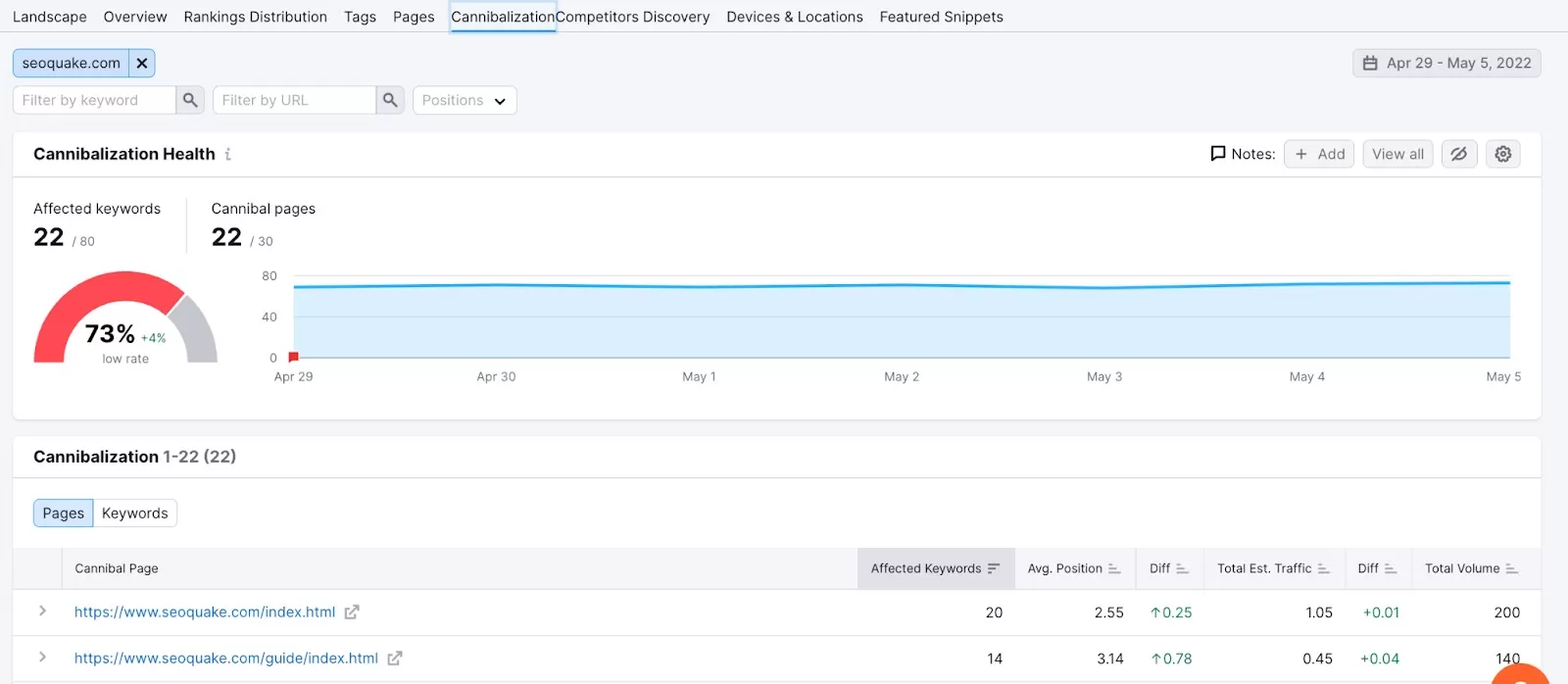 Cannibalization Report: Found within the ‘Organic Research’ module, this report lists all the keywords for which you have multiple website pages ranking simultaneously. It will display the level of keyword overlap, allowing swift identification.