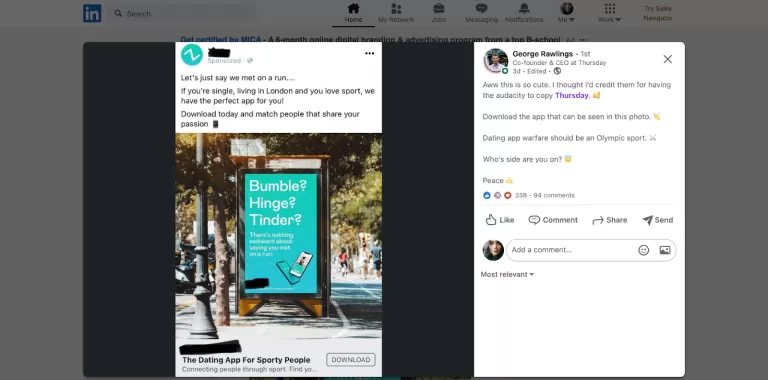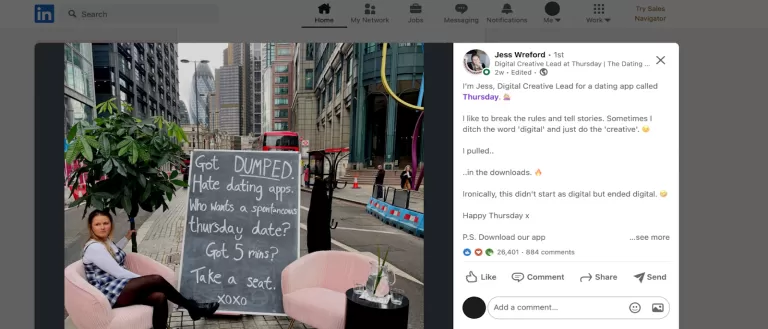 Social media platforms are also a great way to put forth your brand’s mission, vision, and values.Let’s take a dating application named Thursday, for instance. Thursday has made a lot of buzz around social media (especially LinkedIn) pertaining to their marketing efforts. While they are undertaking OOH marketing campaigns, they are promoting the same on social media.