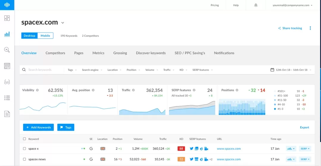 The name says it all. Rank Tracker is one of the oldest rank tracking tools that are still operational. It has survived the test of time by strengthening its data sourcing capabilities while simultaneously making its interface more intuitive.
