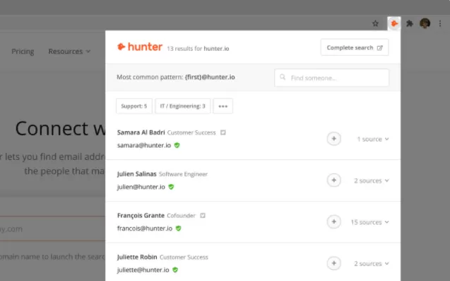 Hunter is a contact-finding tool that will reveal the email addresses associated with virtually any website. Since Hunter sources its results from publicly available sources of information where the email addresses with the requested domain extension are used, it is not always successful. Having said that, I have personally experienced a 90%+ success rate Hunter.io.