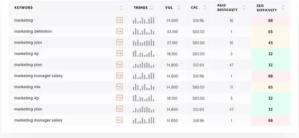 Similarly, the RankWatch keyword research tool has a special feature that allows you to identify ‘low hanging fruits’. Basically, the tool will give you a separate list of keyword suggestions that are both relevant to your (or your client’s) business and relatively easier to rank for.