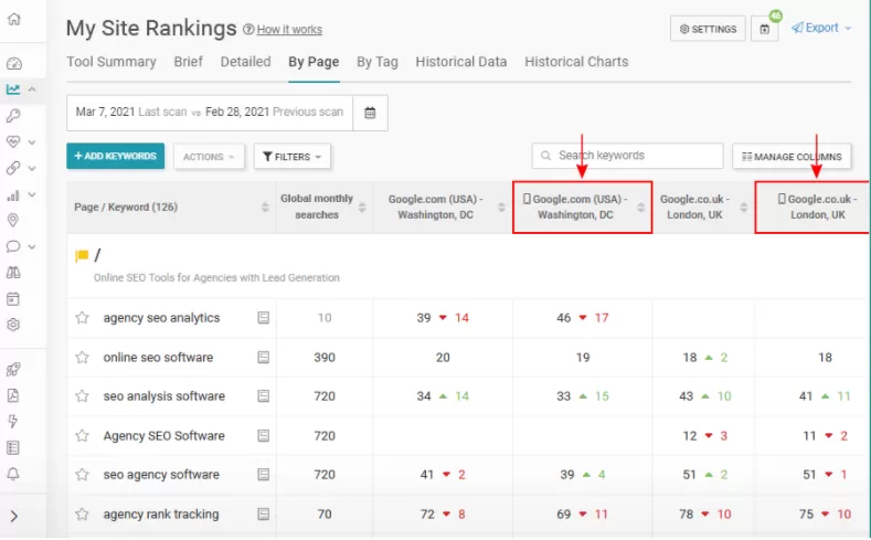 Another noteworthy ability of Rank Ranger is that it lets you track your (or your client’s) website rankings in Google and Bing ads.