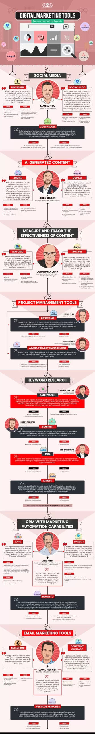 In this infographic, we have assembled the top digital marketing tools for social media marketing, developing AI-assisted content, evaluating and tracking content performance, keyword research, customer relationship management with marketing automation, and email marketing. To assist you in putting together your digital marketing arsenal, we have highlighted each of their advantages and disadvantages and what digital marketing experts have to say about them.