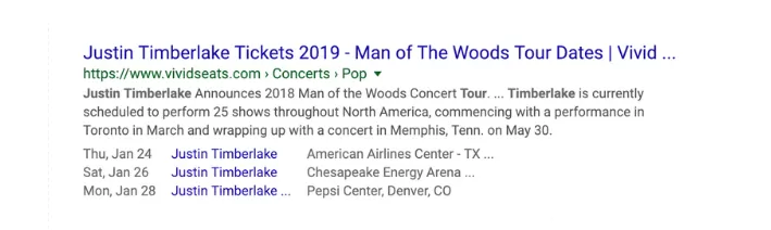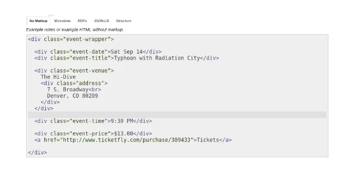 As the name suggests, this markup schema is meant for events and shows details like time, date, and location.
