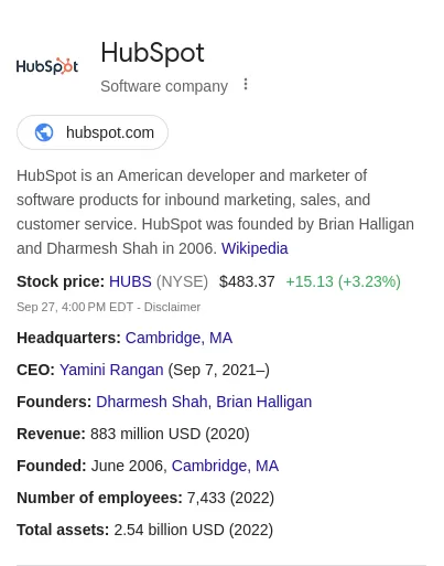 As the name suggests, this markup type offers essential information about an organization. It includes the company’s name, brand logo, and contact information. The screenshot below shows an organization schema markup for Hubspot, a leading inbound marketing brand.
