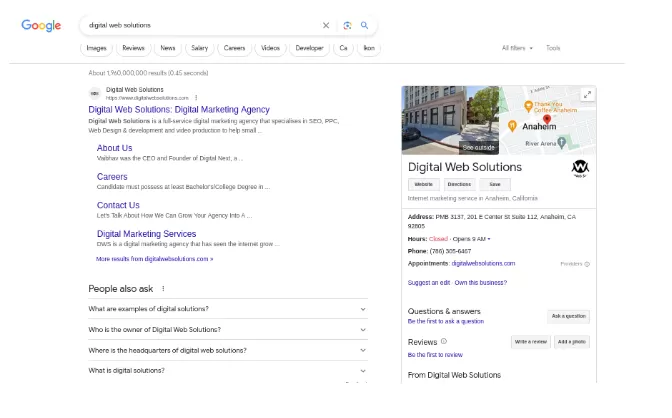 Exclusive for local businesses, this markup includes an organization’s details like name, address, phone number, and business hours. The screenshot below shows a local business schema markup for DWS, a digital marketing agency. You can see all relevant details like address, phone number, website, operating hours, and Google Maps location.