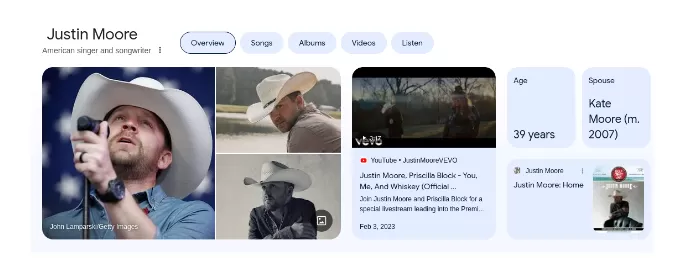 Often used for personal branding, this markup type shows details about a person. It includes the individual’s name, about, image, and relevant social media profiles. Here’s an example of a person market schema markup for American country singer and songwriter Justin Moore.