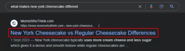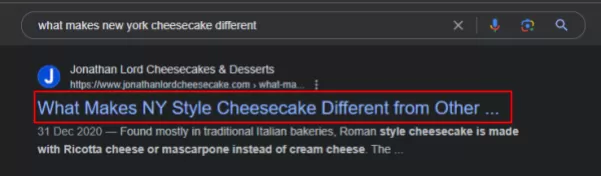 The web page talks about how New York cheesecake is different from regular cheesecake. The title tag for this web page is 64 characters, and it got cut with ellipses (represented as ‘…’), displaying only 51 characters worth of title tag.