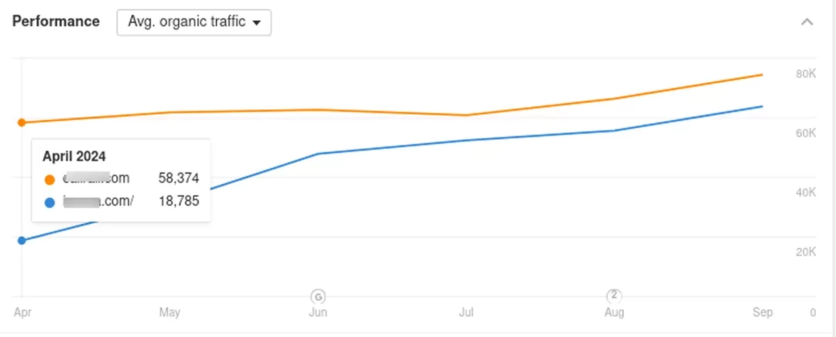 Within 6 months, the client’s monthly traffic increased by 239.3%, rising from 18,785 visitors to 63,780 visitors monthly. This surpasses the growth rate of their competitor, who experienced a 27.6% increase.