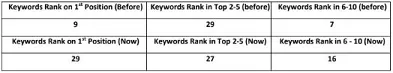 Search rankings (positions in SERPs) before and after