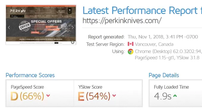 - When running the GTMetrix’ website speed test on ‘perkinknives.com’, we found out their website was loading slow.