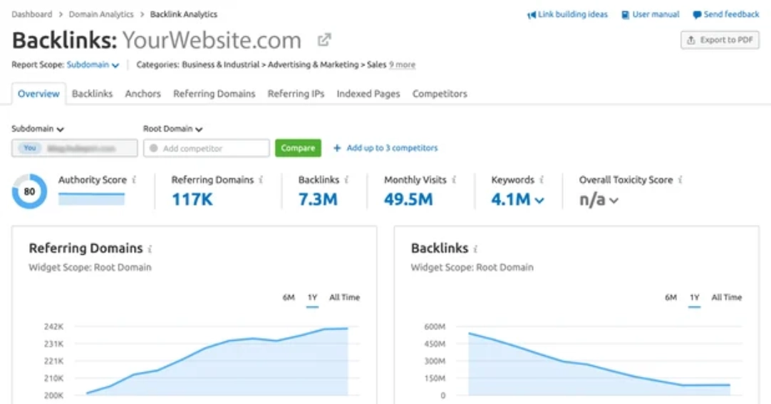 The first thing in a backlink analysis is to examine the overall number of backlinks that lead visitors to your site. You can compare this number with the total backlinks your competitors have to find out overall authority. As you may already know, pages with the highest number of total backlinks usually rank high in Google search results. By analyzing the total number of backlinks to your website, you get a clear picture of your site’s online reputation.