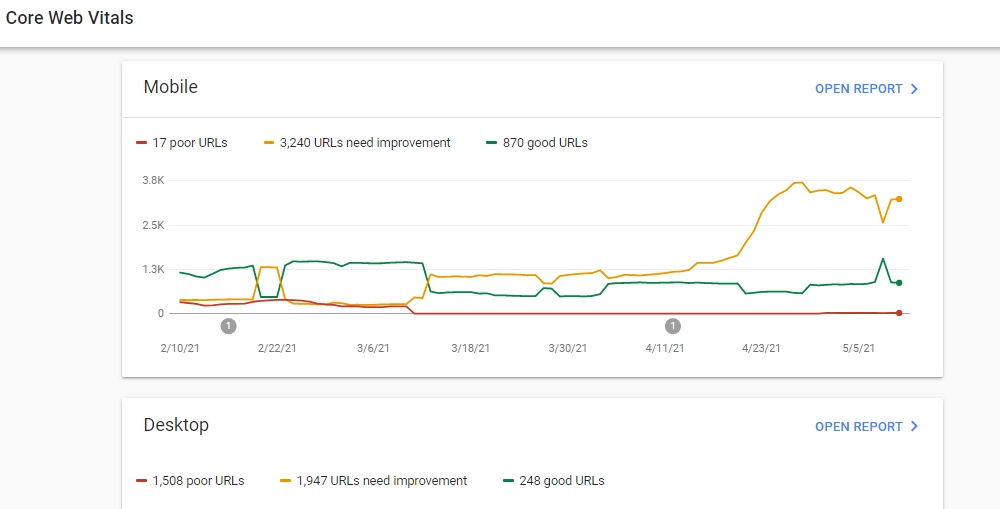- Google Search Console: The Google Search Console utilizes real-world data to show how well the core web vitals are working. To check the core vitals, log into your Google Search Console and click on open reports. You will see the performance of your website for both desktop and mobile devices. In addition to this, the tool also categorizes the pages on your website into “good,” “needs improvement,” and “poor.” This categorization helps you understand the problems present on the pages and take appropriate action.