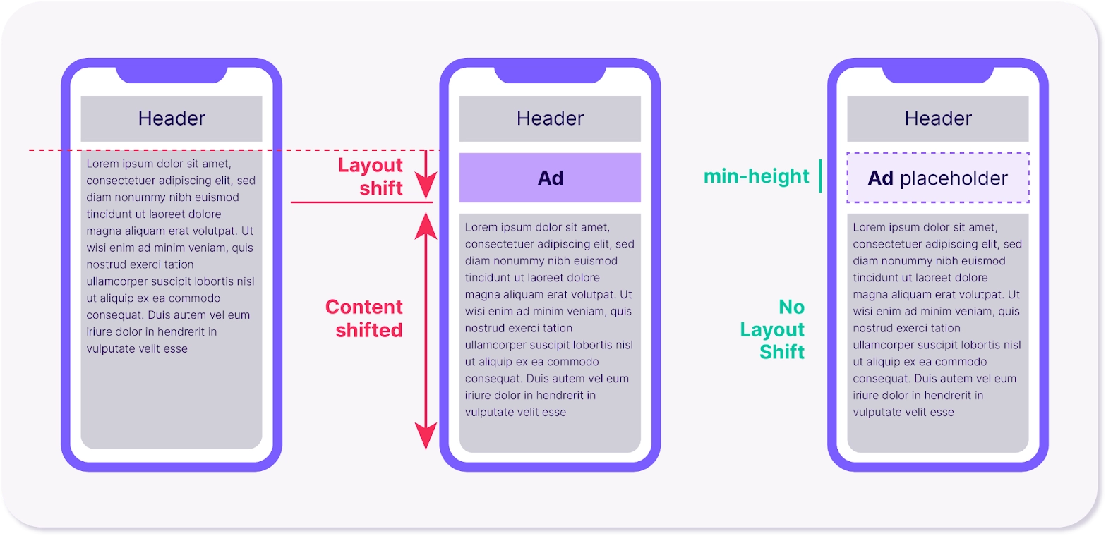 - Make use of ad placeholders with fixed dimensions to make it easier to render them when the page is loading. It can significantly reduce shifts.
