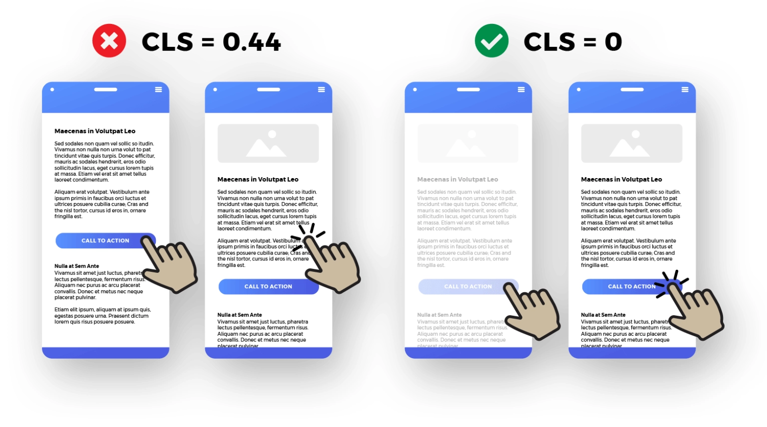 By following the same example (as used to explain impact fraction), if the image shifts by say 700px, which is 30% of the viewport size. Due to this, the CLS will be 0.75 x 0.30 = 0.225. How To Improve Your Cumulative Layout Shift Score
